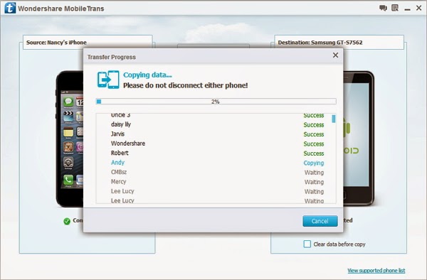 Note: Empty all the data in your destination phone if you like by clicking “Clear data before copy”.